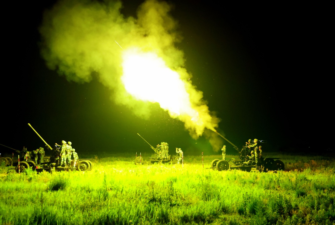 水兵陸戰隊某旅組織跨日夜實彈射擊練習訓練,某型高炮夜間對空中目的實行衝擊(2021年6月9日攝)。新華社發(尚文斌 攝)