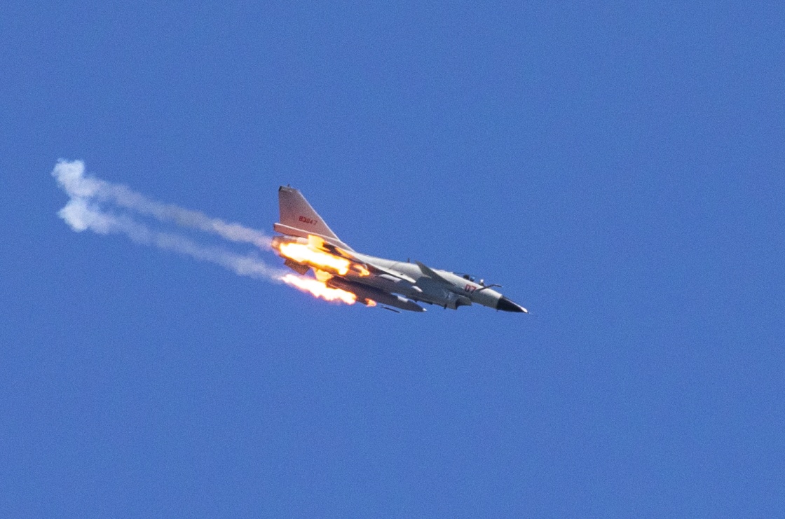 台灣東邊戰區水兵航空兵某旅組織地靶實彈射擊練習,殲-10戰機對地進犯(2021年9月10日攝)。新華社發(趙寧寧 攝)