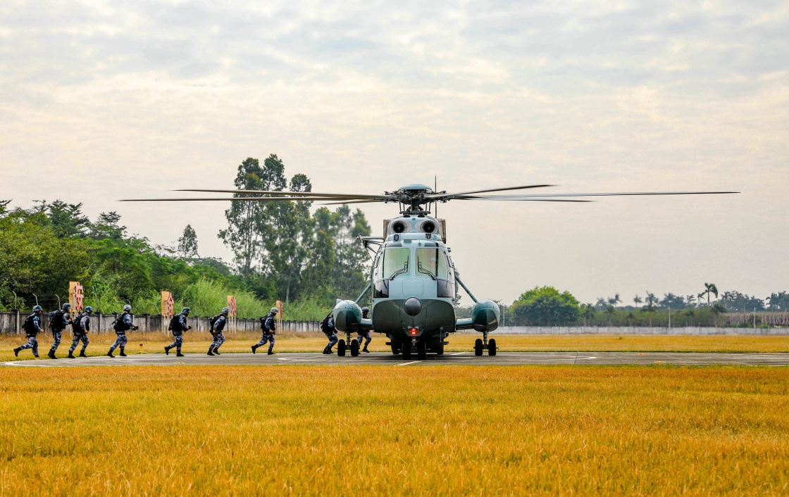 水兵陸戰隊某旅組織空位餐飲業體檢協同練習訓練,特戰隊員搭乘直升機預備奔赴目的空域(2021年6月16日攝)。新華社發(林凱祥 攝)